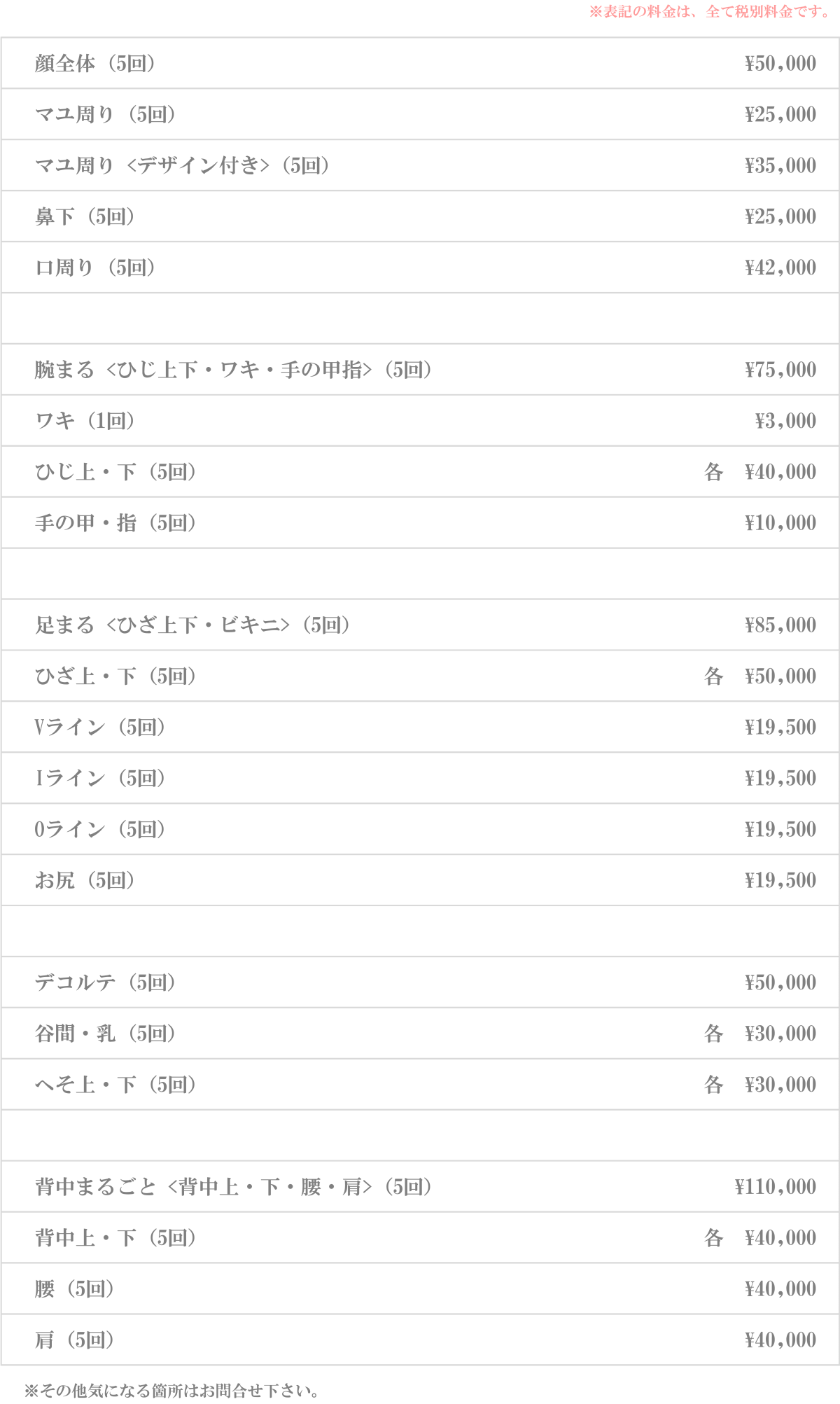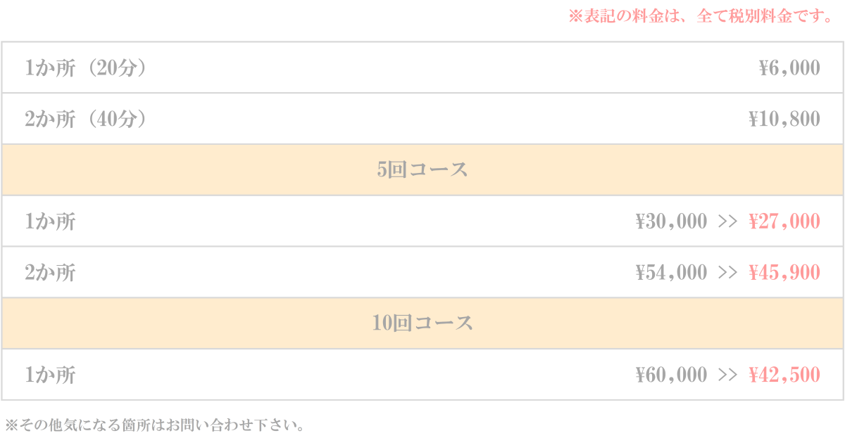 メニュー以外の他の部位もご相談下さい。お気軽にお電話でのお問い合わせもお待ち致しております。
